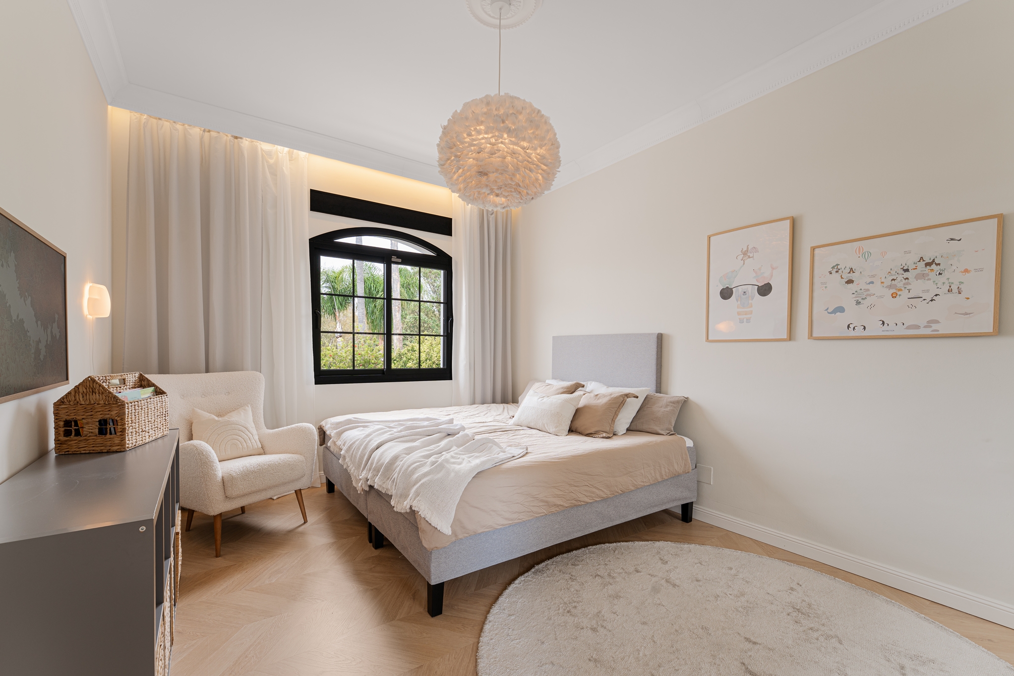 The master bedroom is an ideal private oasis, exuding comfort and style. The bedroom is connected to a private terrace that sports panoramic views of the surrounding area and Mediterranean sea.