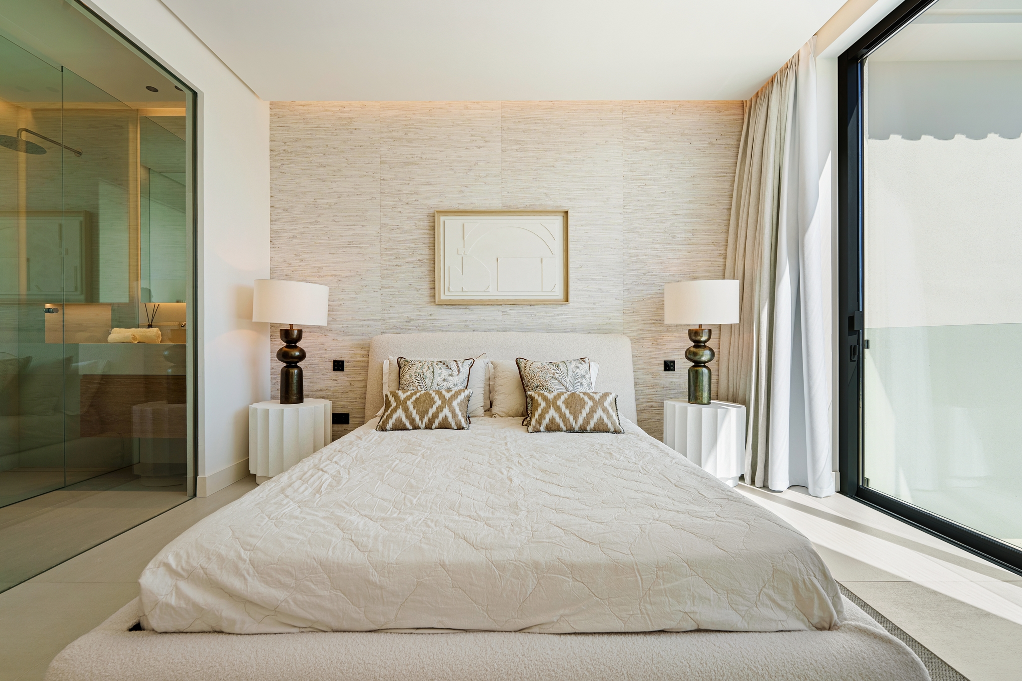 The master bedroom is an ideal private oasis, exuding comfort and style. The bedroom is connected to a private terrace that sports panoramic views of the surrounding area and Mediterranean sea.