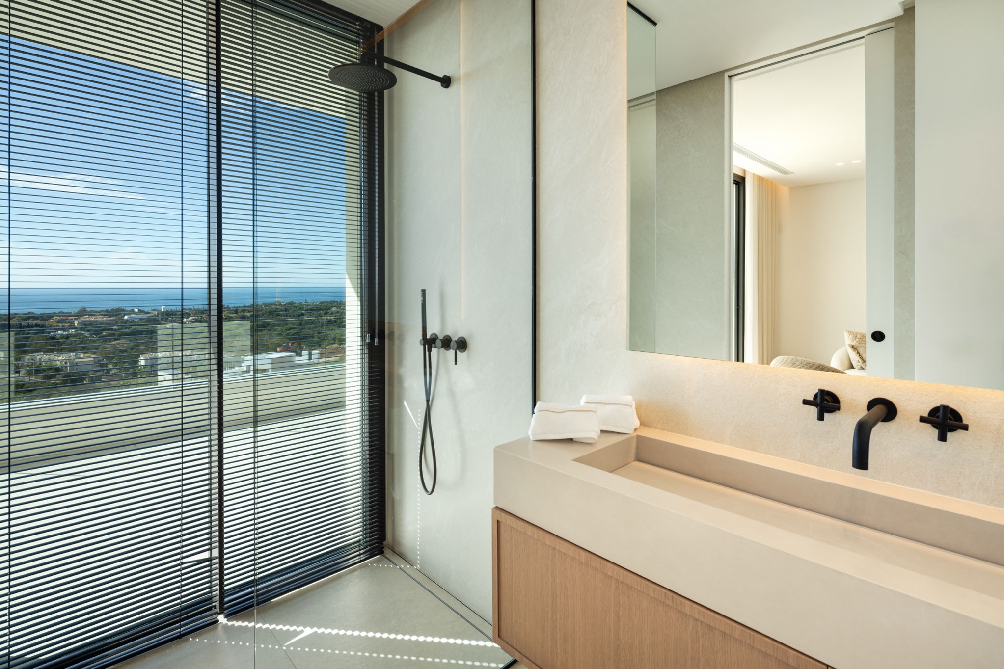 The master bedroom is an ideal private oasis, exuding comfort and style. The bedroom is connected to a private terrace that sports panoramic views of the surrounding area and Mediterranean sea.