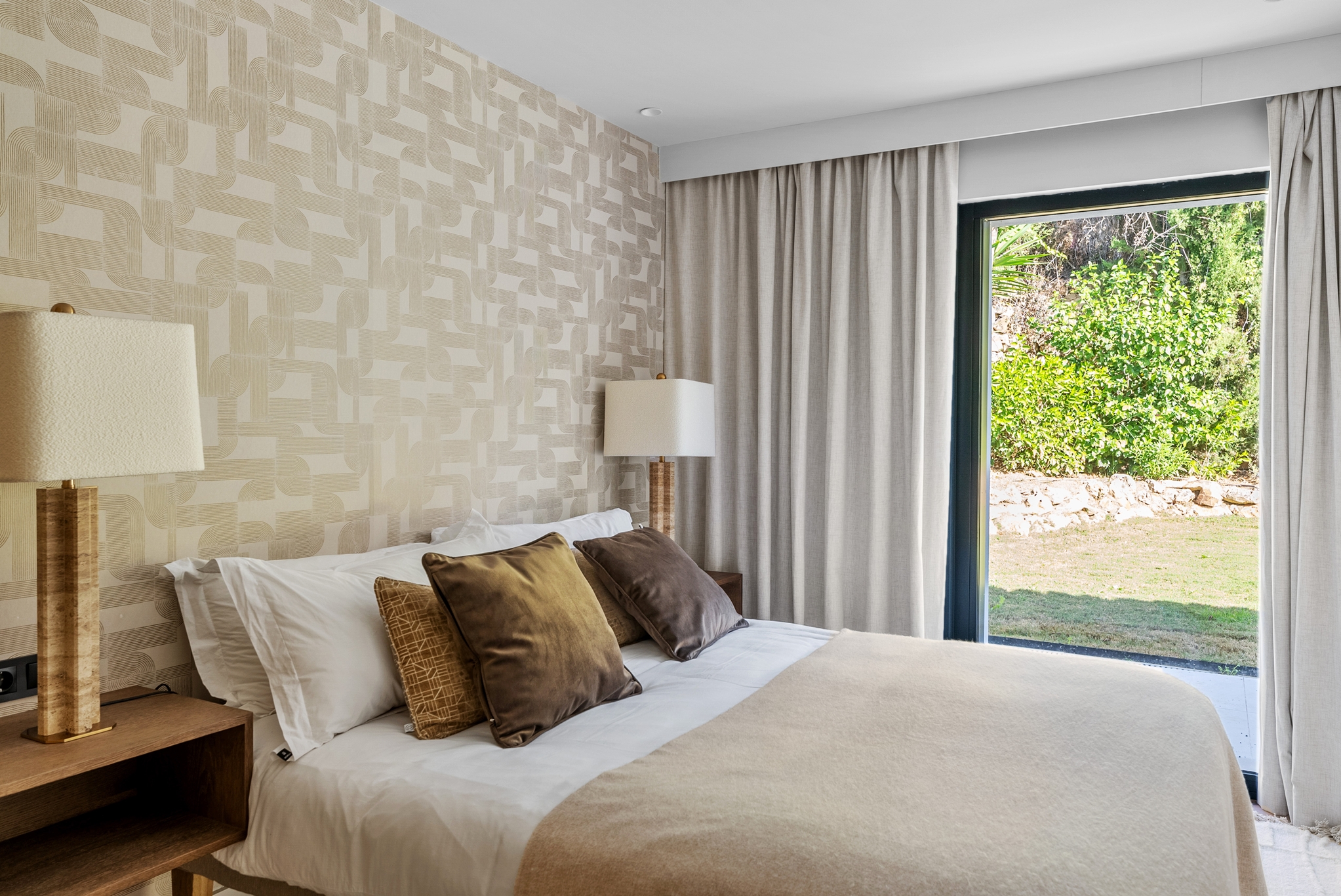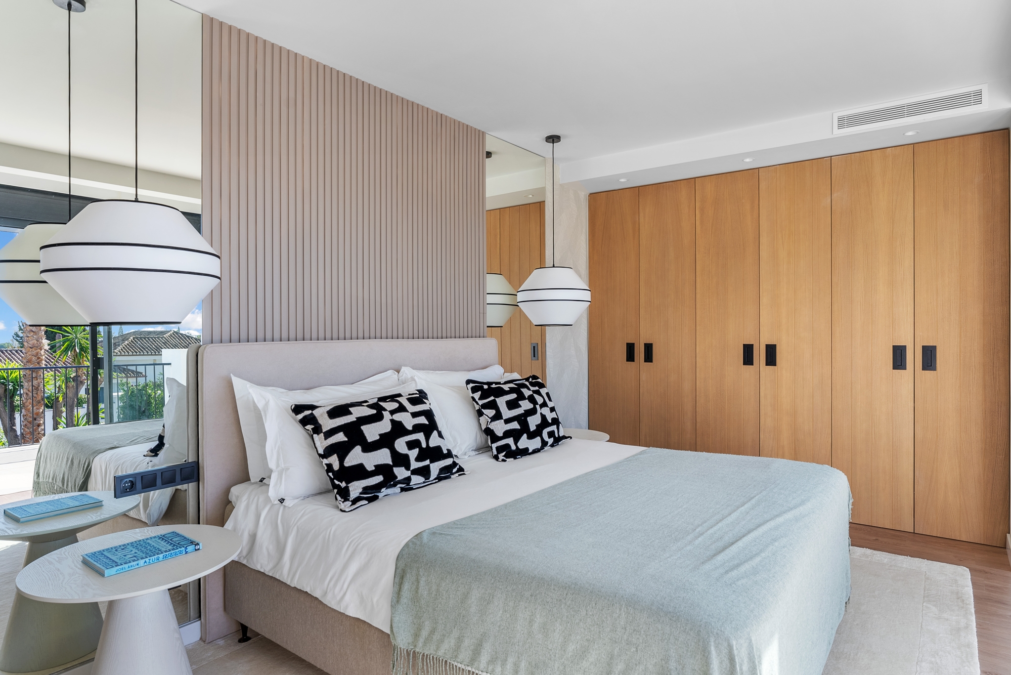 The master bedroom is an ideal private oasis, exuding comfort and style. The bedroom is connected to a private terrace that sports panoramic views of the surrounding area and Mediterranean sea.