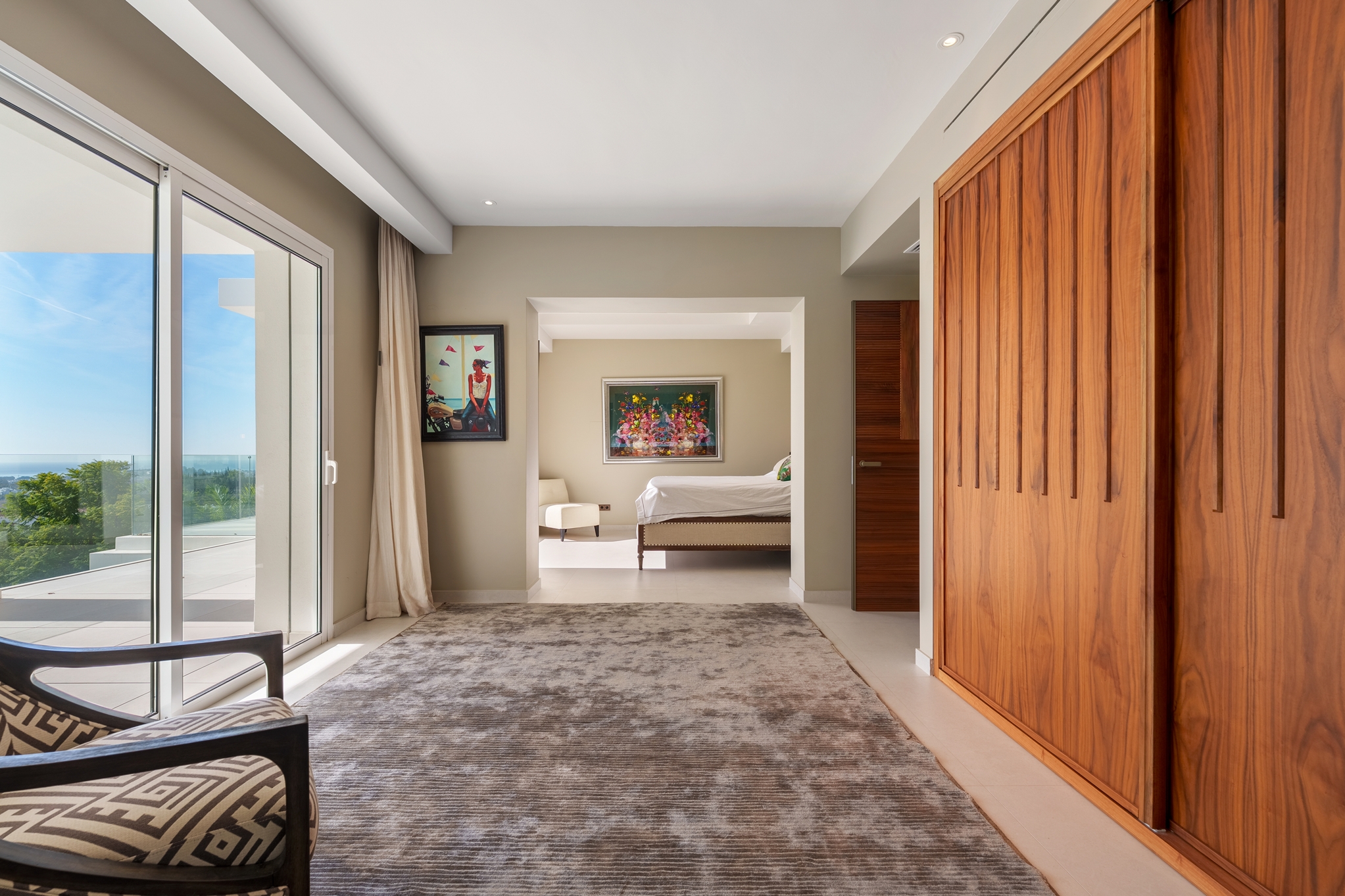 The master bedroom is an ideal private oasis, exuding comfort and style. The bedroom is connected to a private terrace that sports panoramic views of the surrounding area and Mediterranean sea.