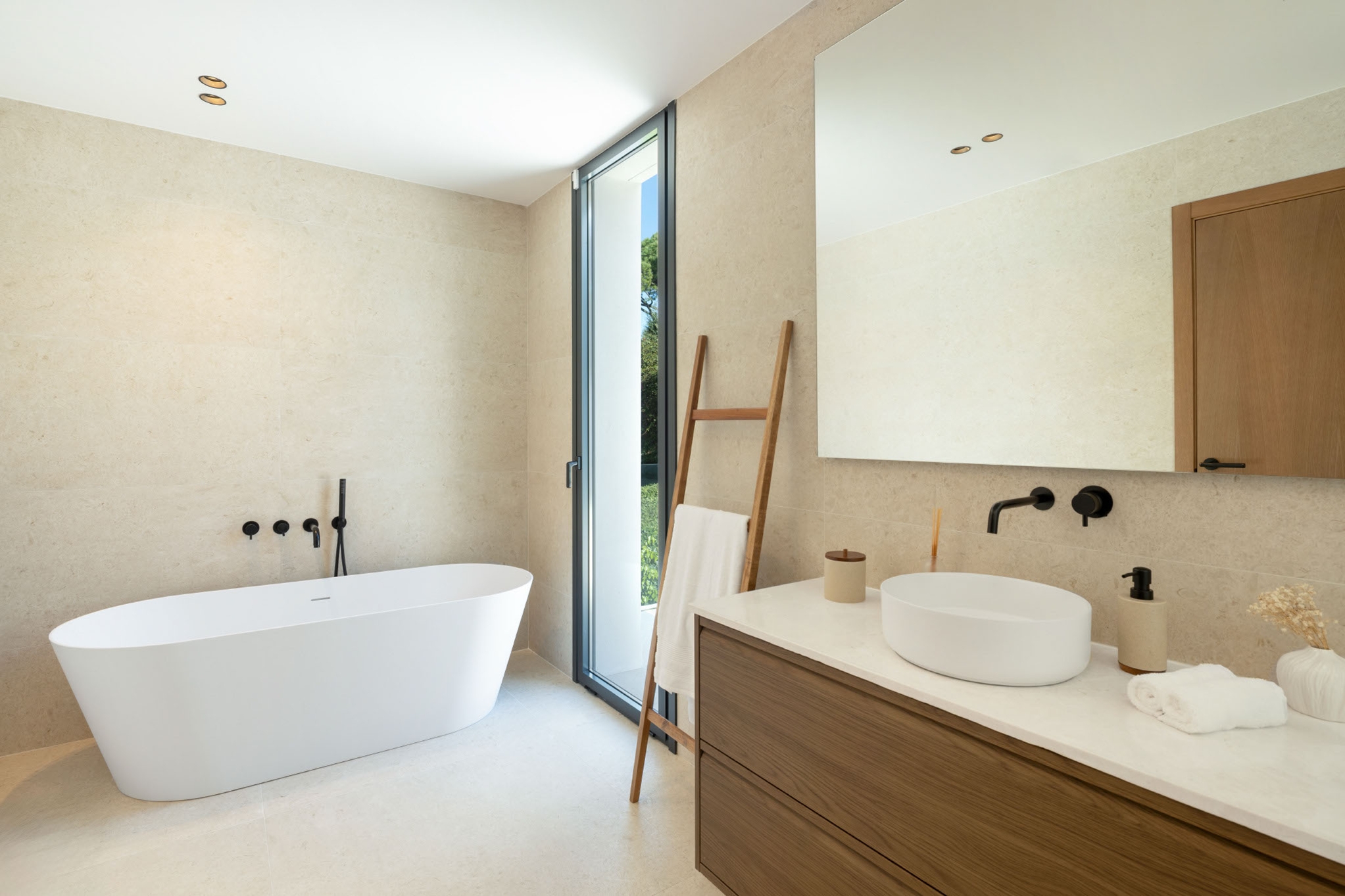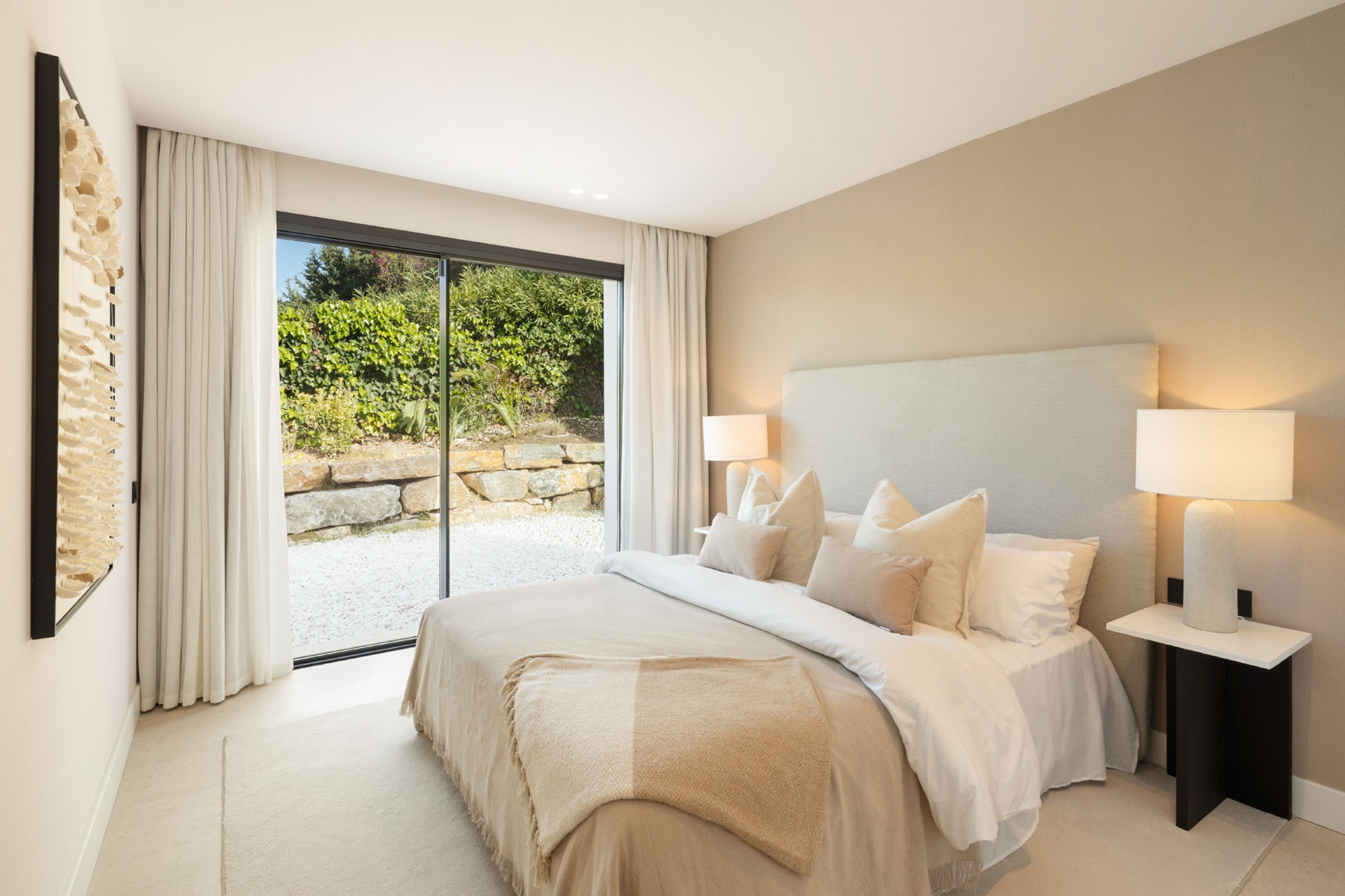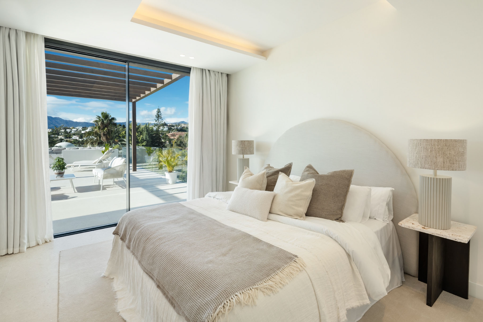 The master bedroom is an ideal private oasis, exuding comfort and style. The bedroom is connected to a private terrace that sports panoramic views of the surrounding area and Mediterranean sea.
