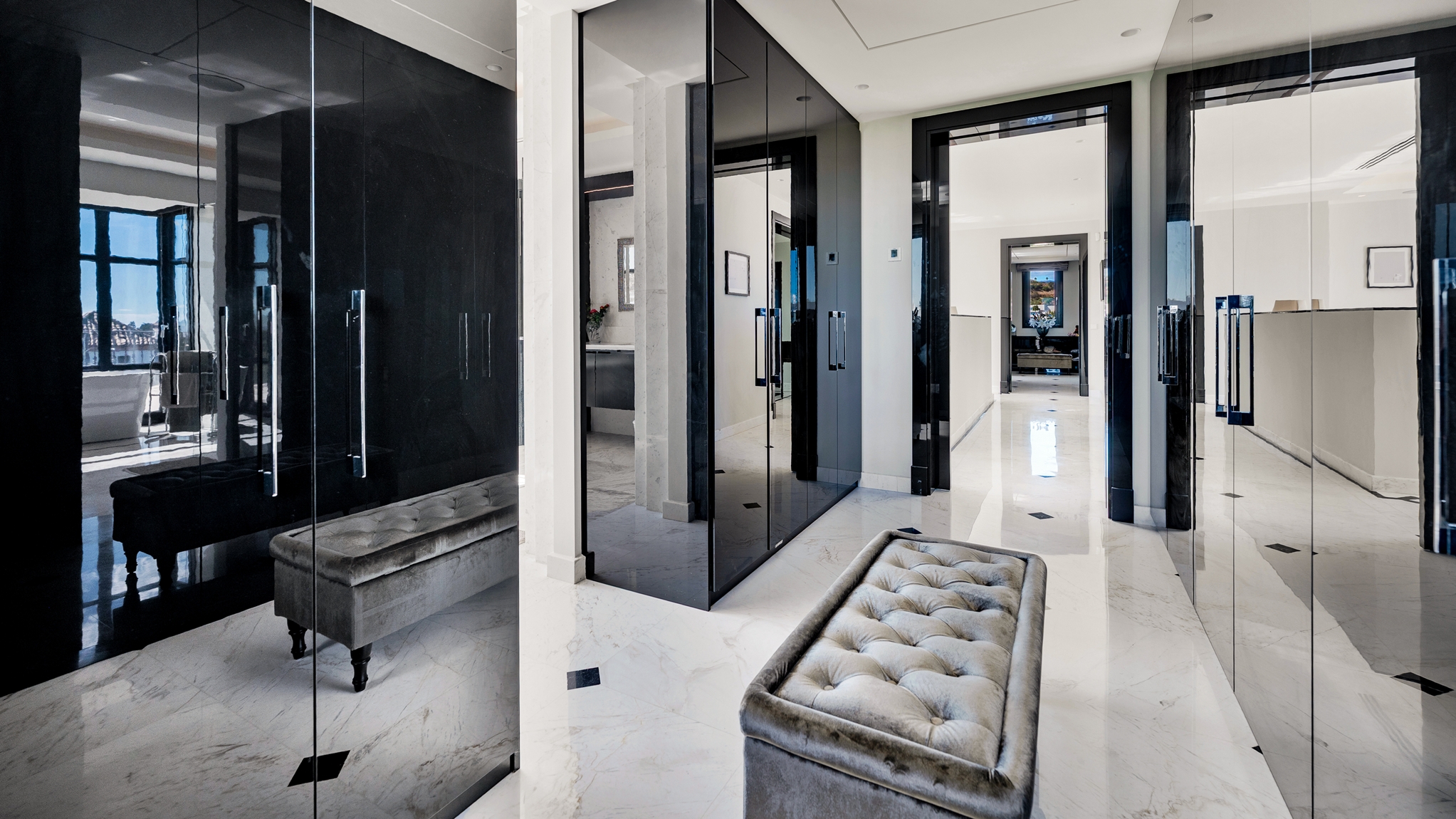 The master bedroom is an ideal private oasis, exuding comfort and style. The bedroom is connected to a private terrace that sports panoramic views of the surrounding area and Mediterranean sea.