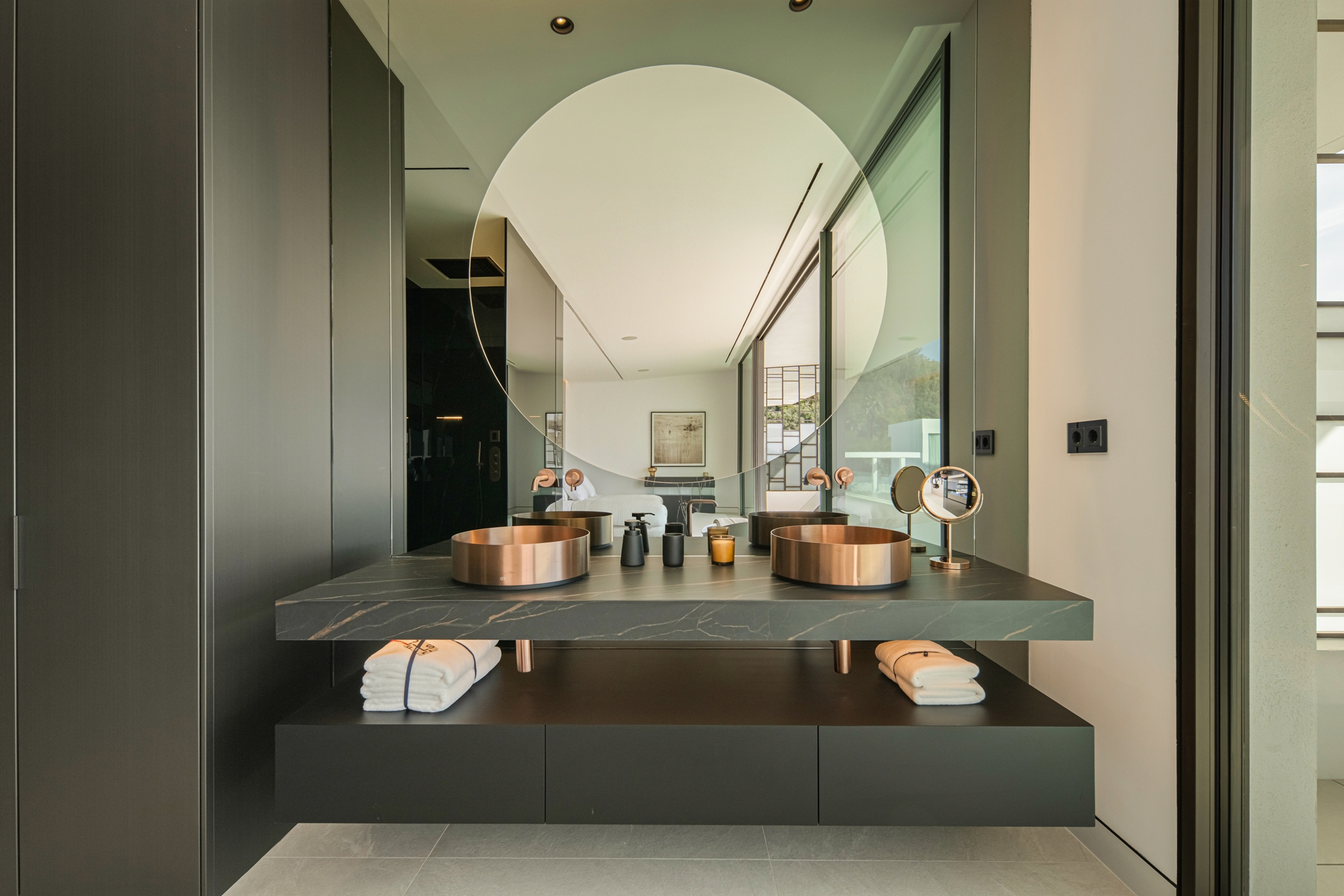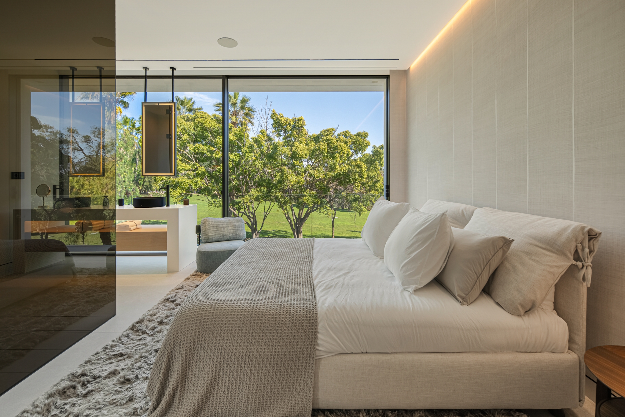 The master bedroom is an ideal private oasis, exuding comfort and style. The bedroom is connected to a private terrace that sports panoramic views of the surrounding area and Mediterranean sea.