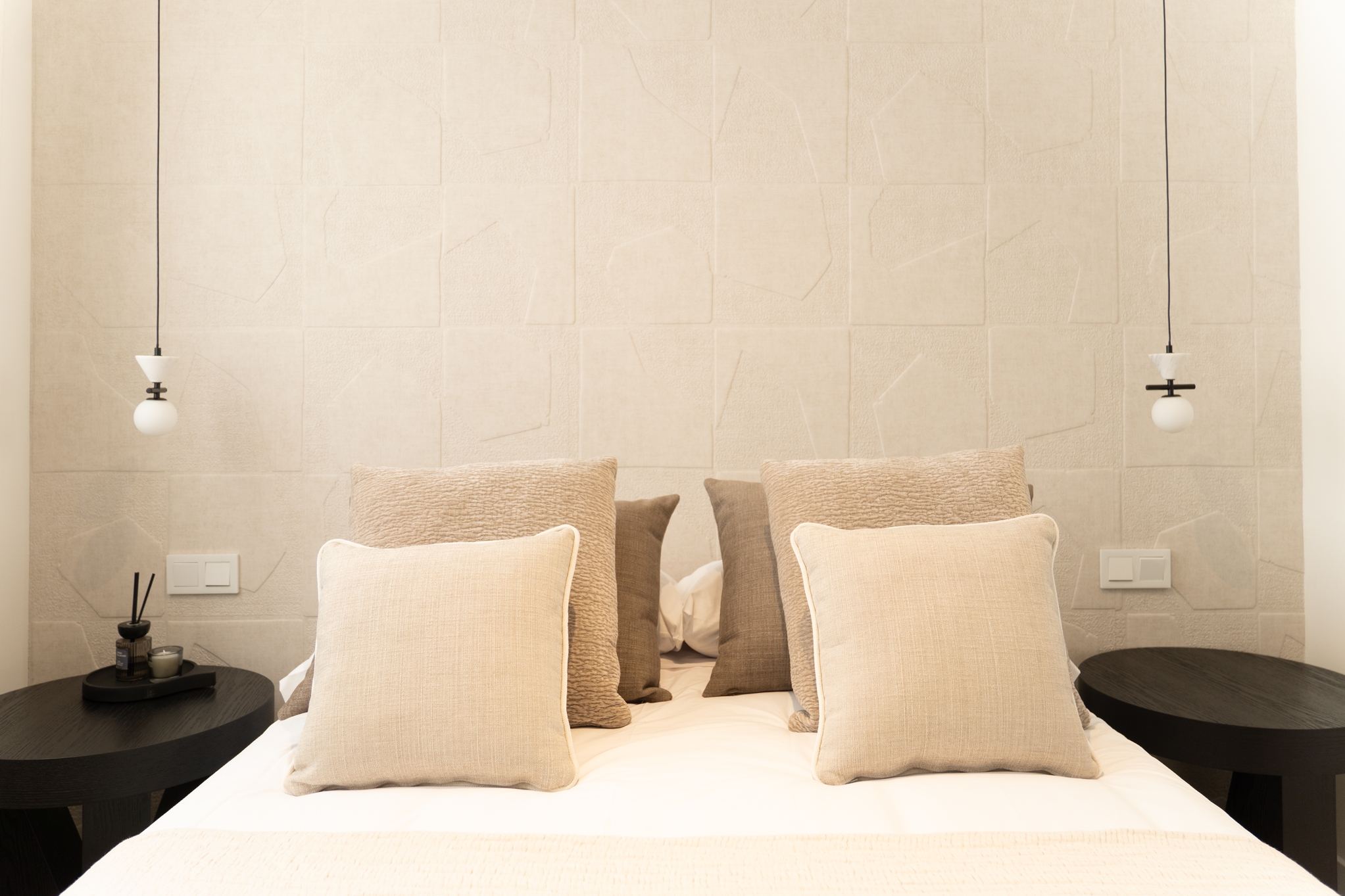 The master bedroom is an ideal private oasis, exuding comfort and style. The bedroom is connected to a private terrace that sports panoramic views of the surrounding area and Mediterranean sea.