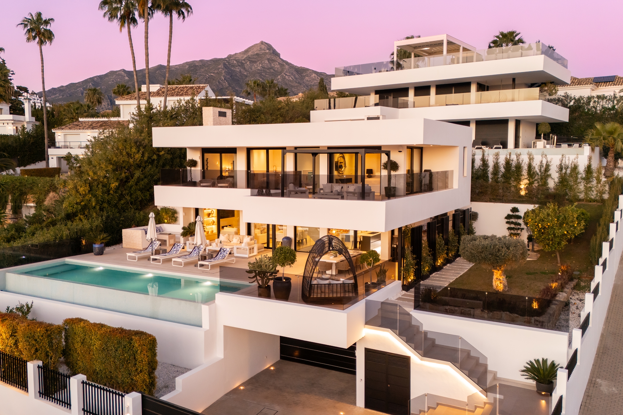 Step into an architectural marvel where every detail speaks of sophistication and style. Indulge in the exquisite interior design, where every corner whispers elegance and comfort. Entertain guests effortlessly in the villa's entertainment level, boasting unparalleled amenities and spaces designed for memorable gatherings.Elevate the living experience with private infinity pools and meticulously landscaped gardens that extend to spacious outdoor terraces. Adding an extra layer of luxury and entertainment, each residence is crowned with a bespoke solarium, offering residents a unique space for leisure and panoramic views of La Concha and the Mediterranean Sea.