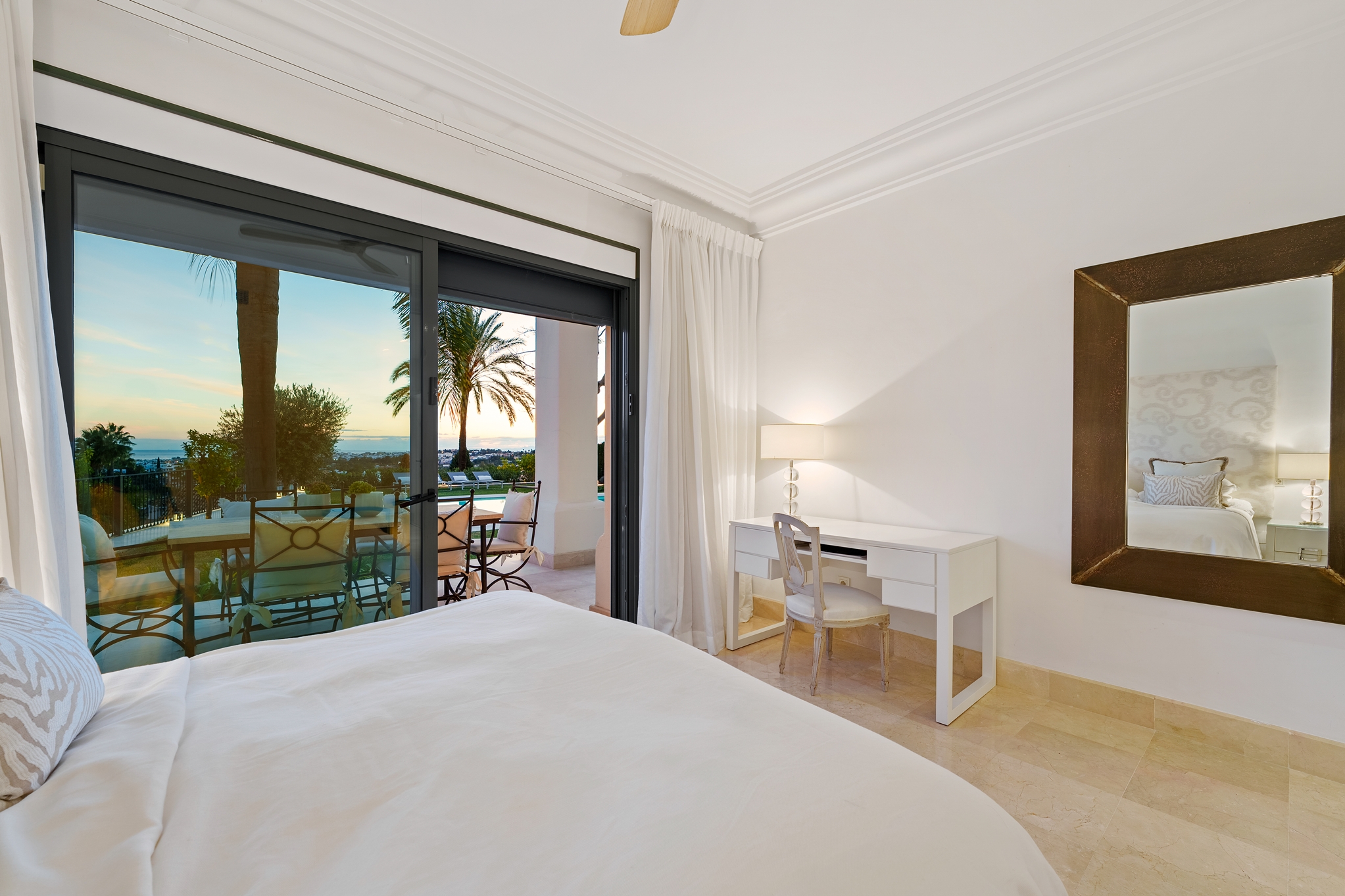 The master bedroom is an ideal private oasis, exuding comfort and style. The bedroom is connected to a private terrace that sports panoramic views of the surrounding area and Mediterranean sea.