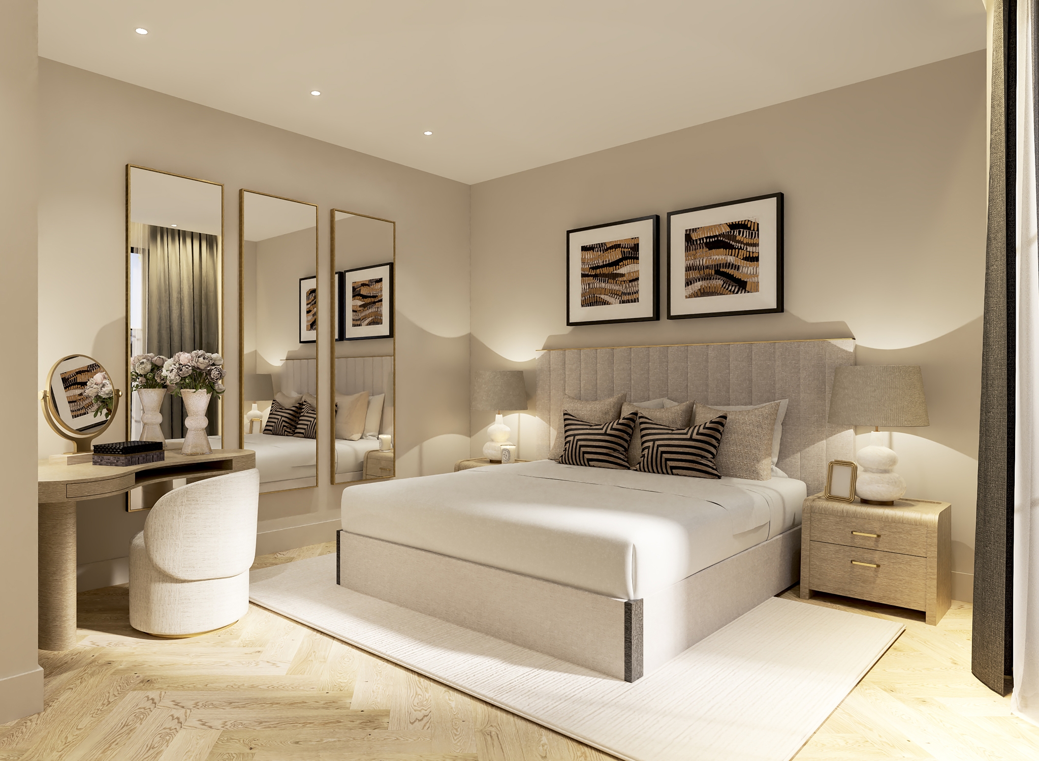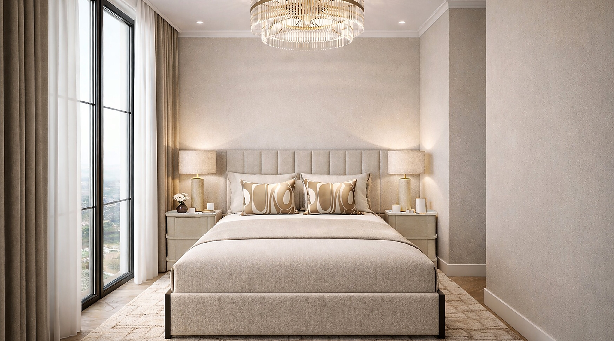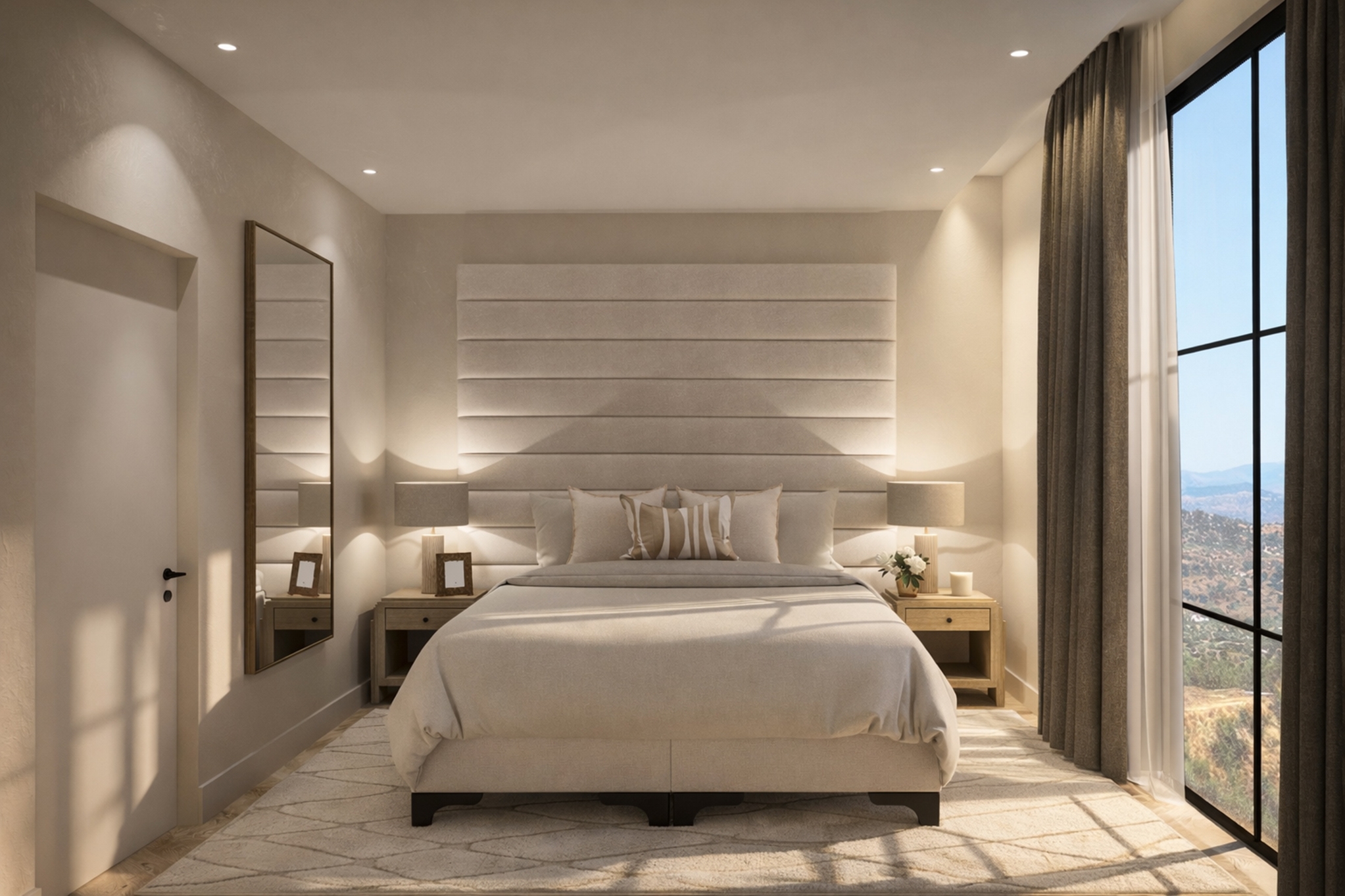 The master bedroom is an ideal private oasis, exuding comfort and style. The bedroom is connected to a private terrace that sports panoramic views of the surrounding area and Mediterranean sea.