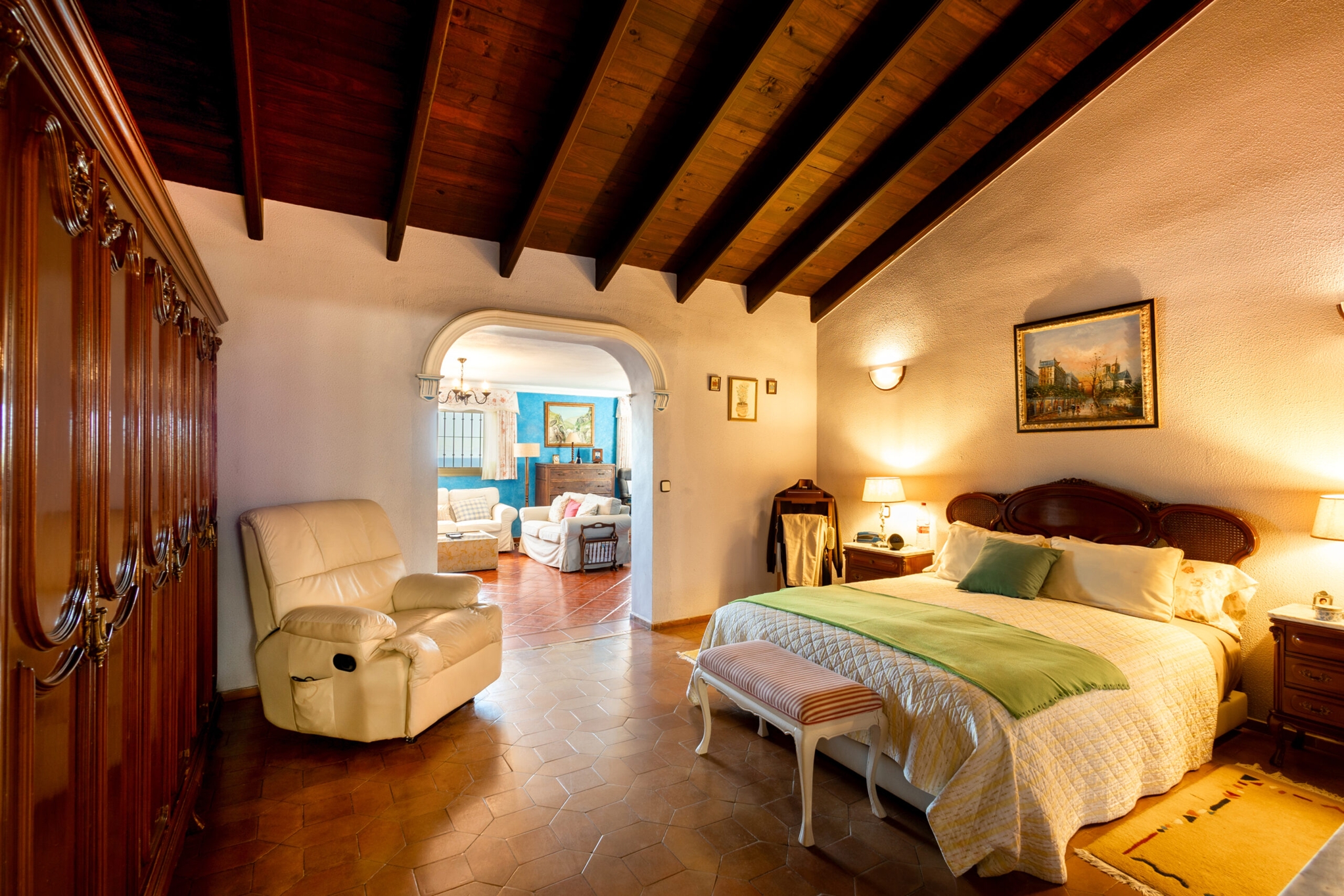 The master bedroom is an ideal private oasis, exuding comfort and style. The bedroom is connected to a private terrace that sports panoramic views of the surrounding area and Mediterranean sea.