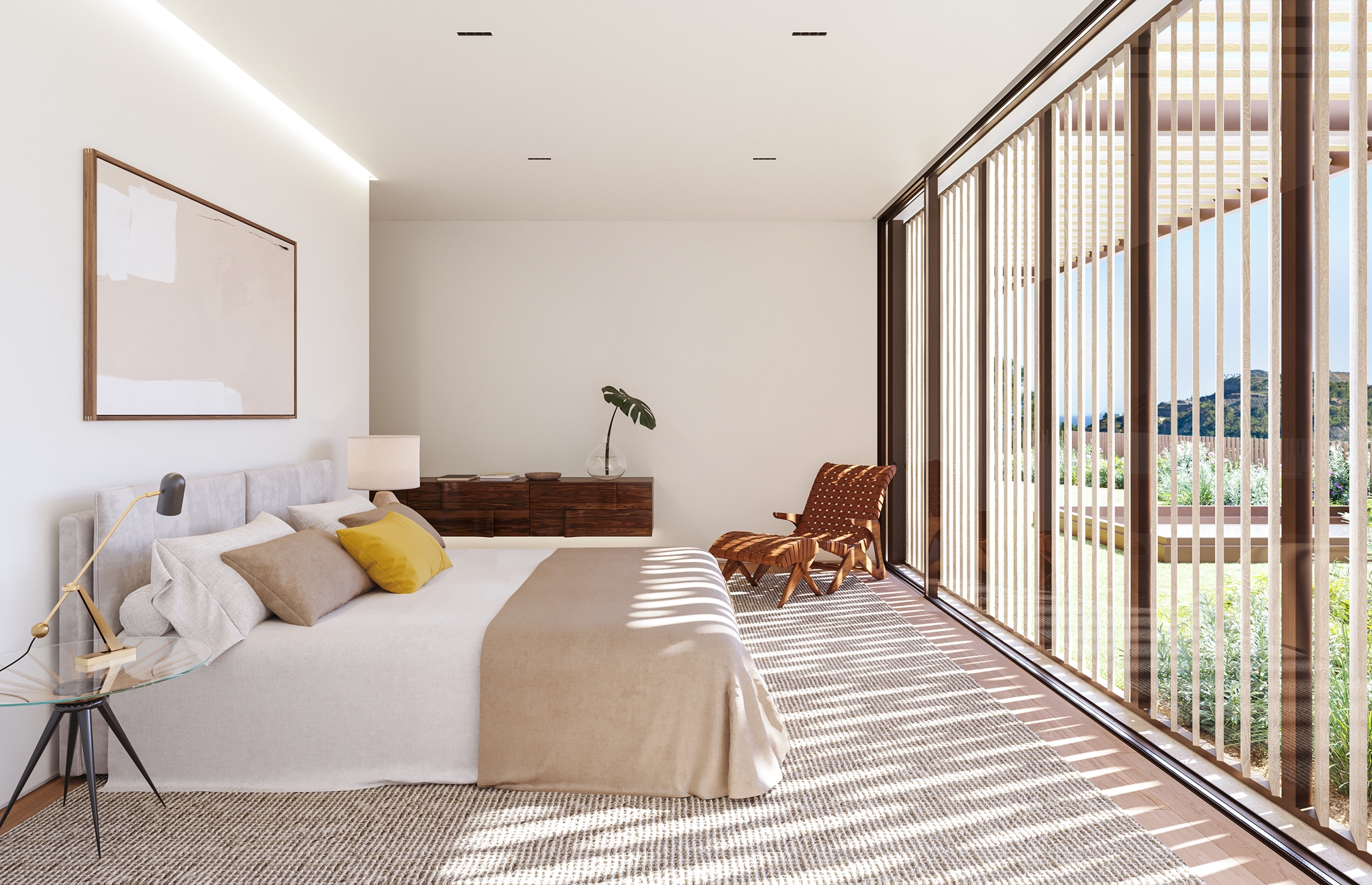 The master bedroom is an ideal private oasis, exuding comfort and style. The bedroom is connected to a private terrace that sports panoramic views of the surrounding area and Mediterranean sea.
