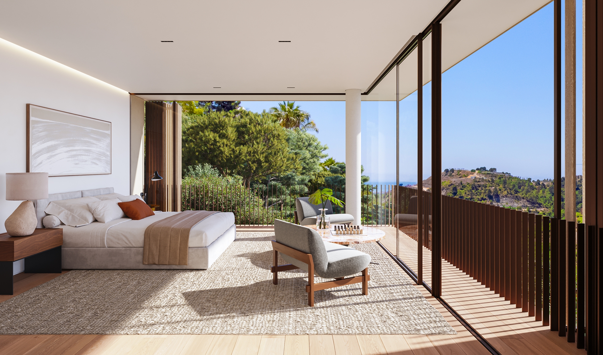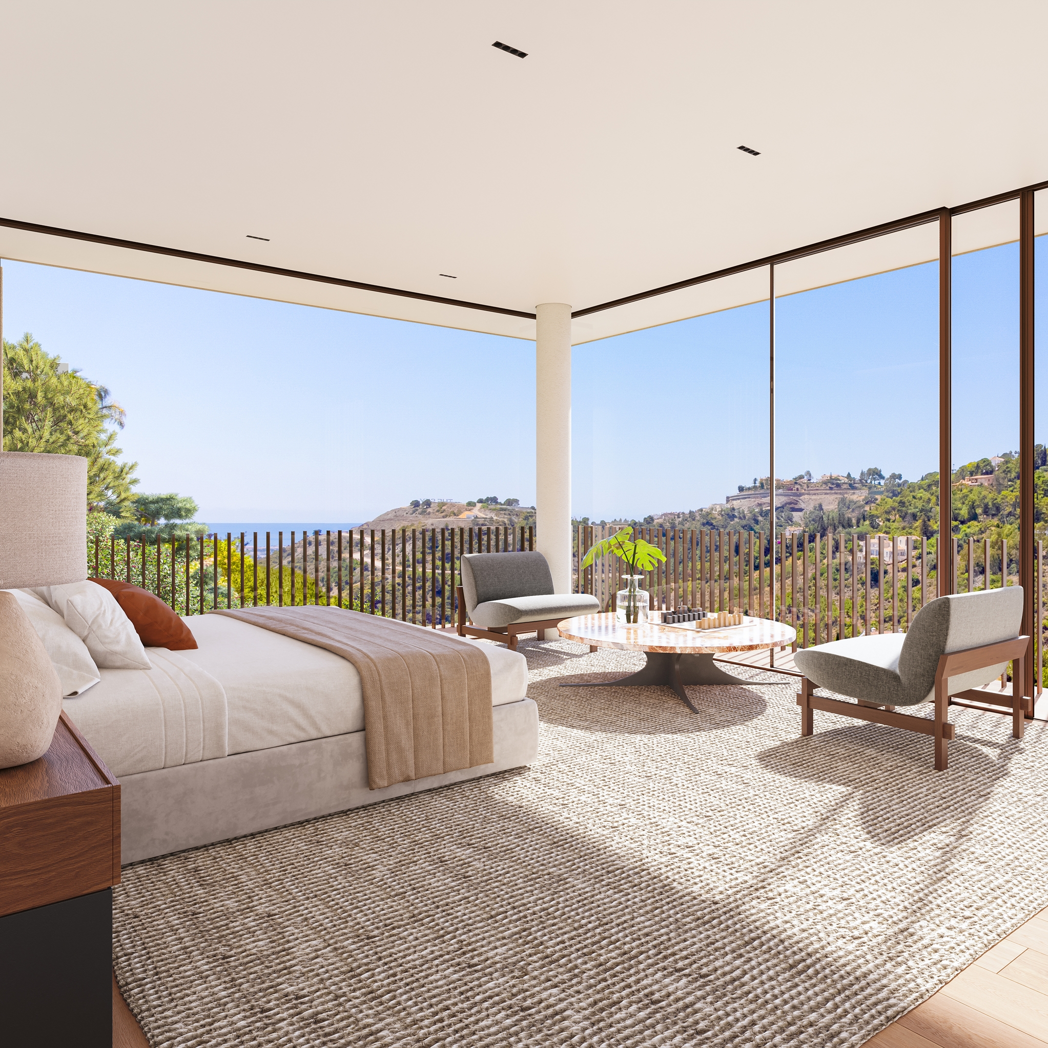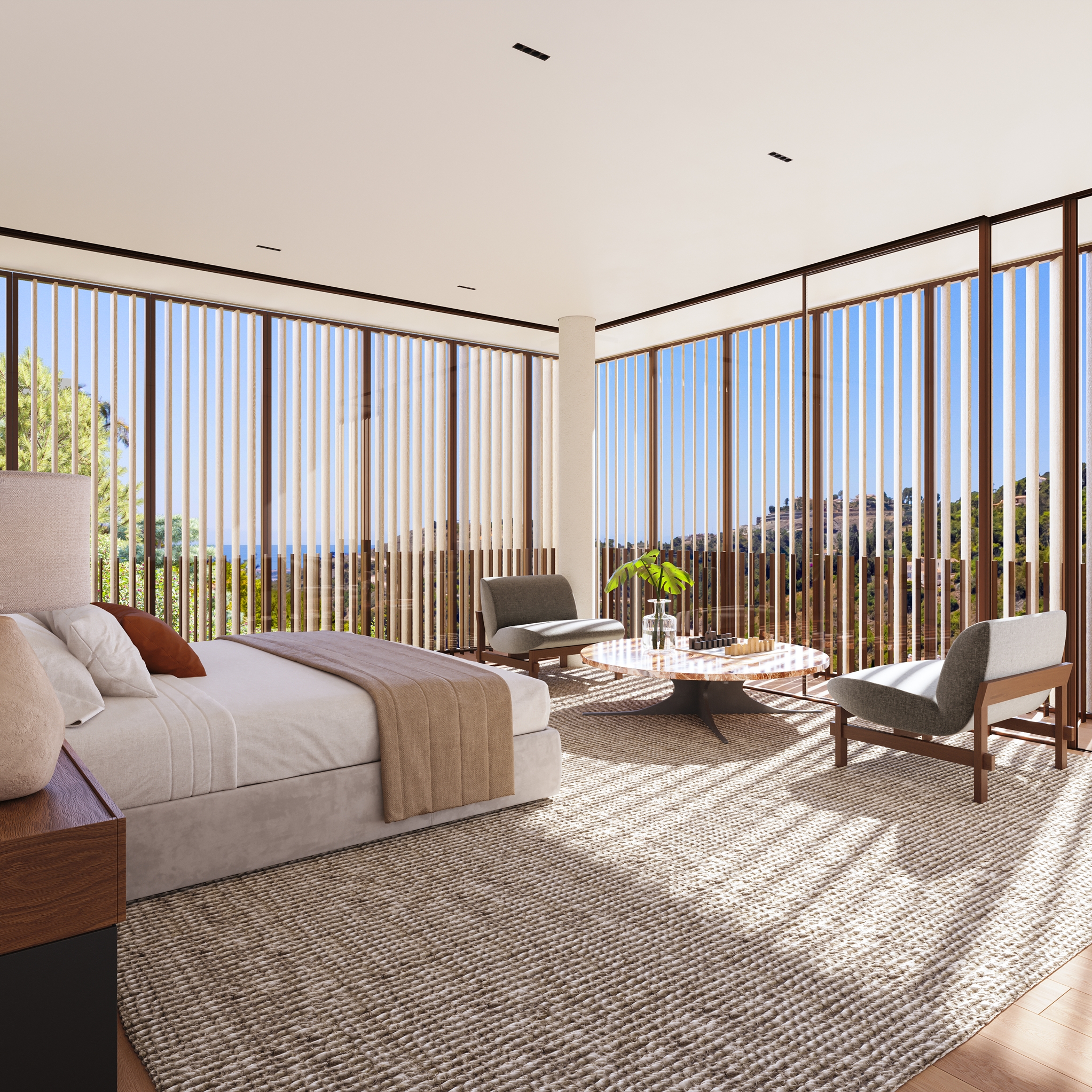The master bedroom is an ideal private oasis, exuding comfort and style. The bedroom is connected to a private terrace that sports panoramic views of the surrounding area and Mediterranean sea.