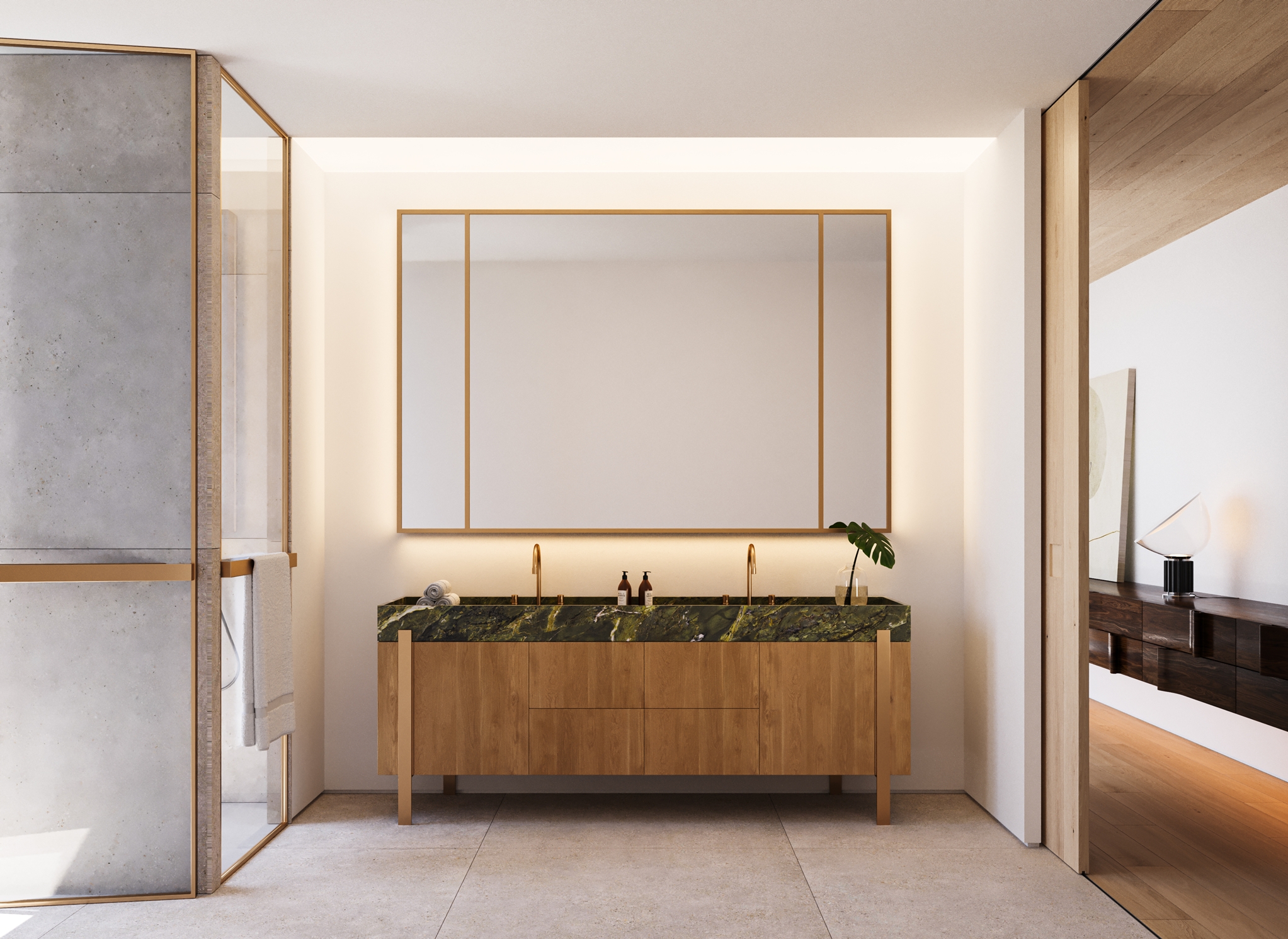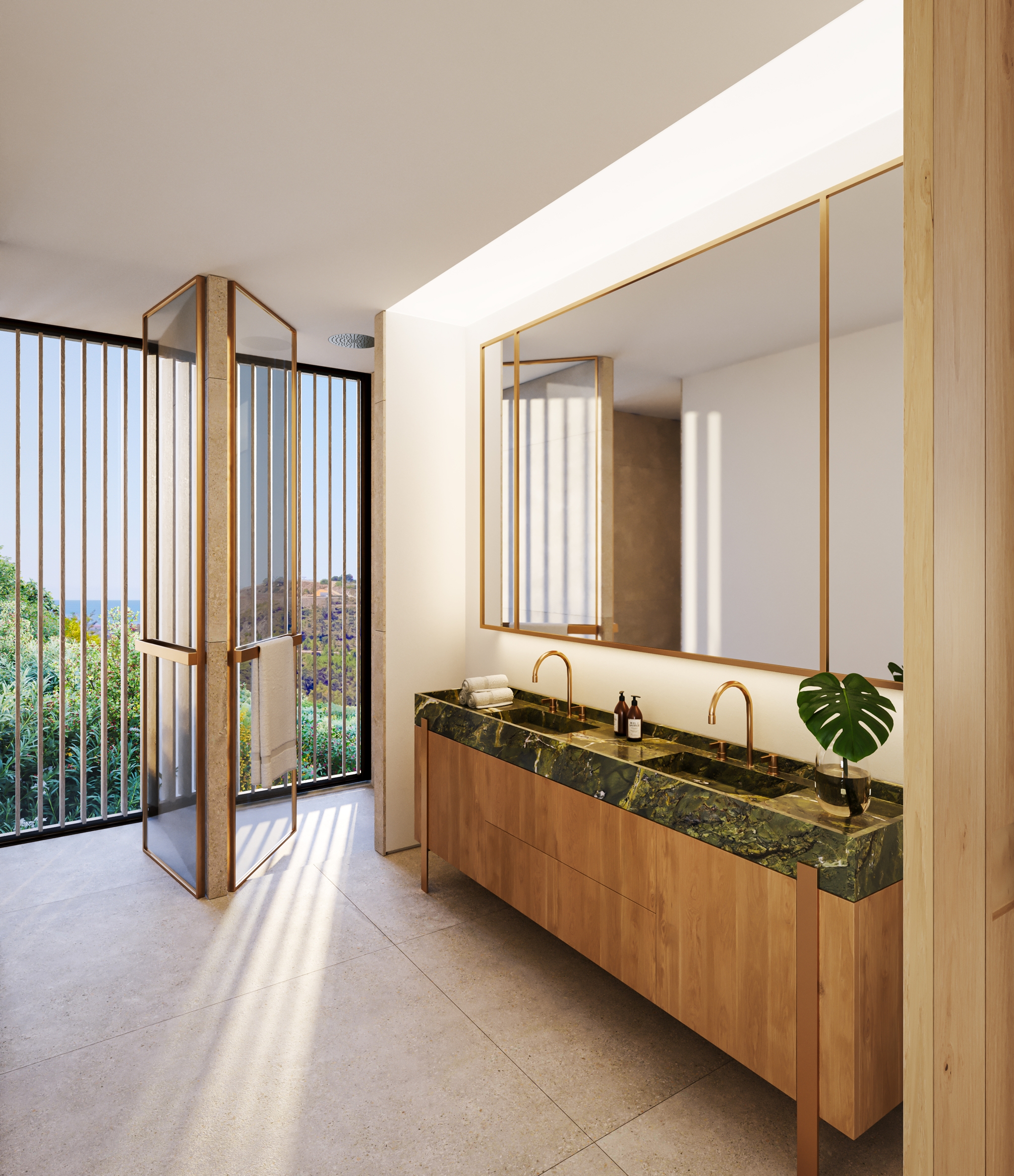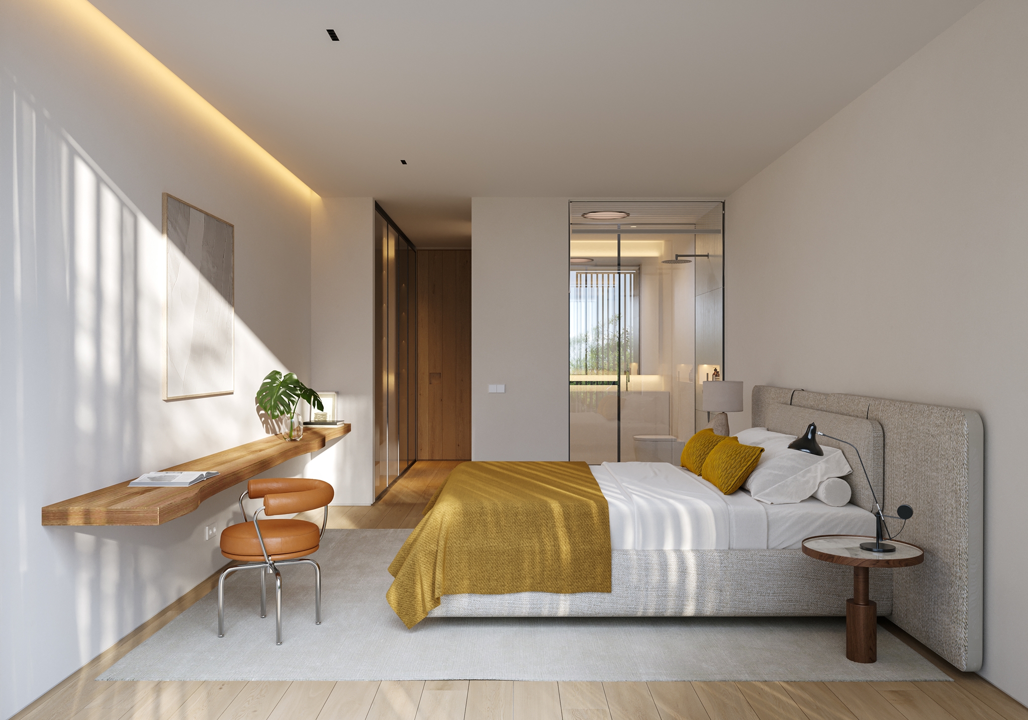The master bedroom is an ideal private oasis, exuding comfort and style. The bedroom is connected to a private terrace that sports panoramic views of the surrounding area and Mediterranean sea.