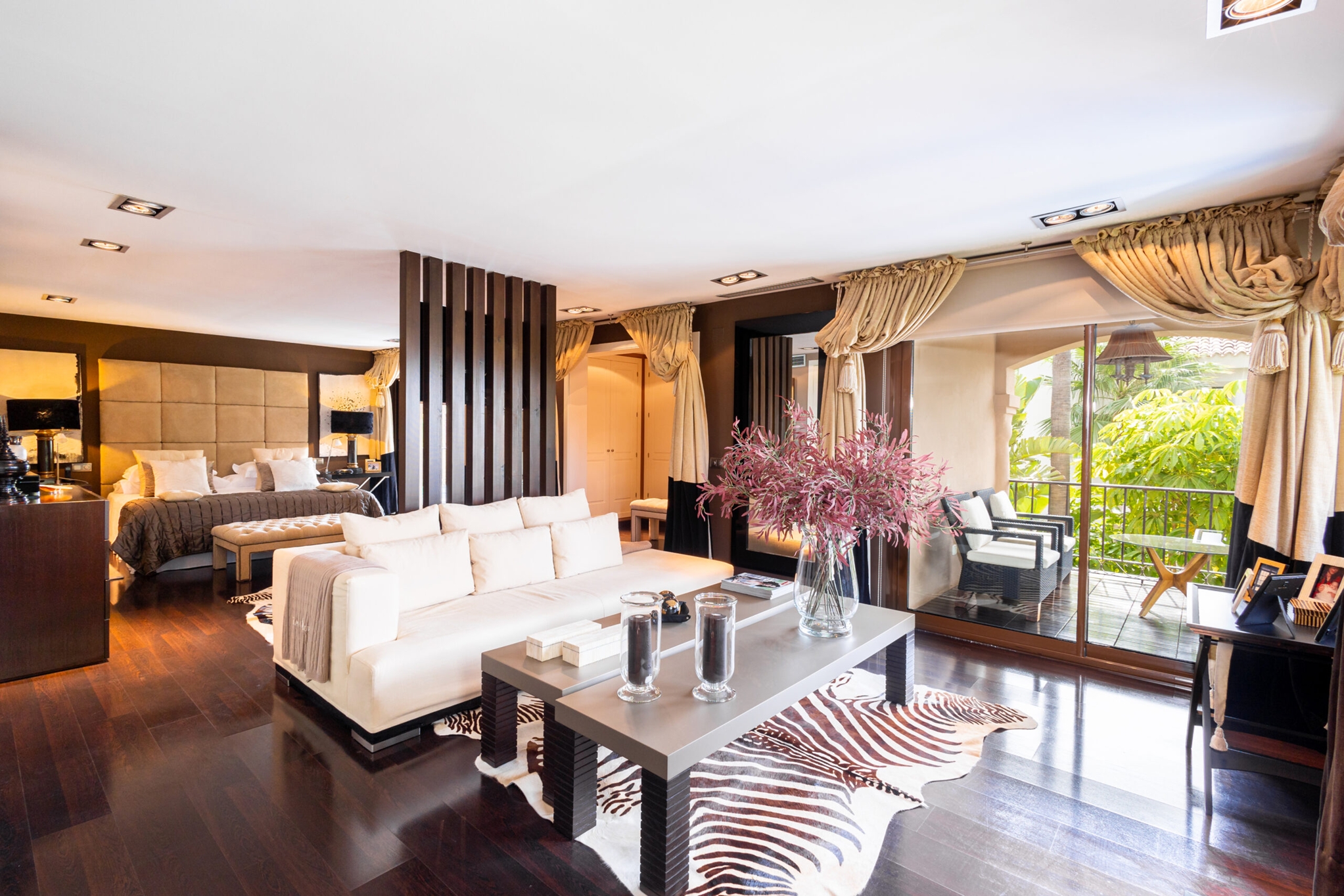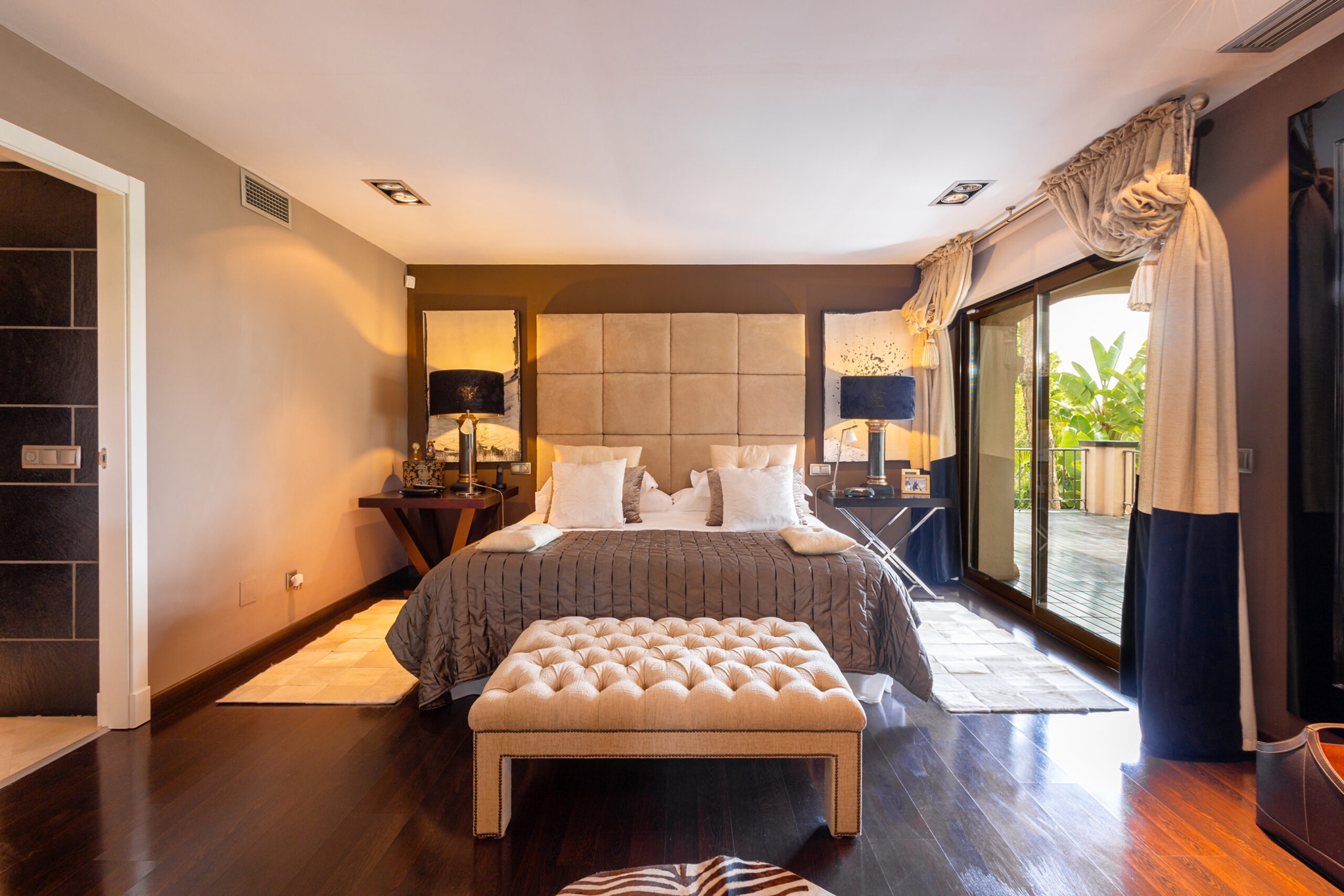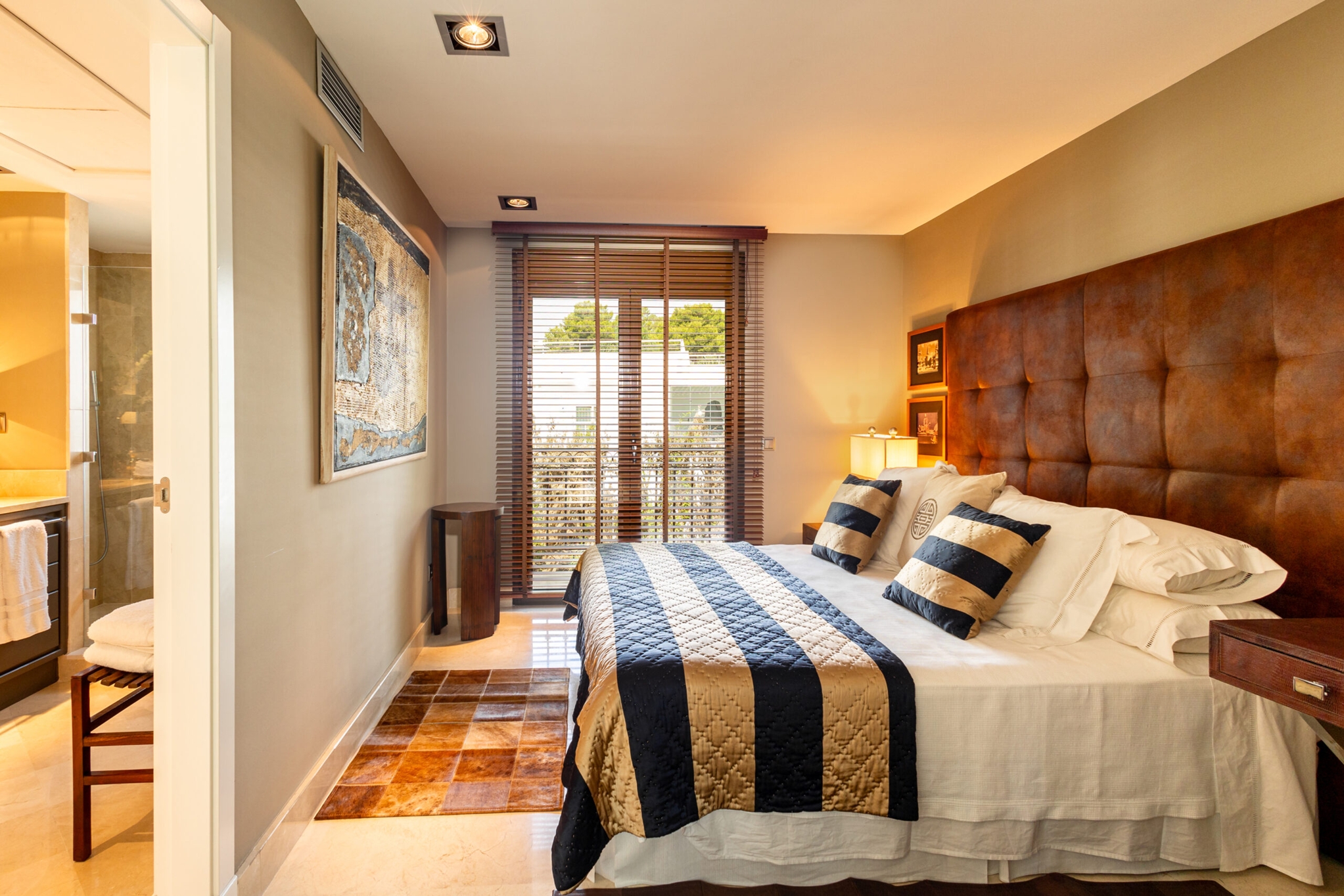 The master bedroom is an ideal private oasis, exuding comfort and style. The bedroom is connected to a private terrace that sports panoramic views of the surrounding area and Mediterranean sea.