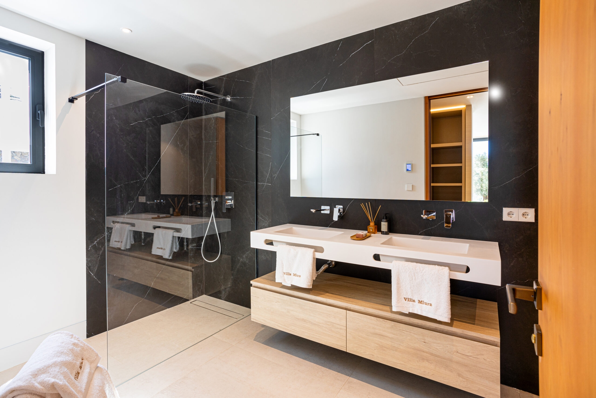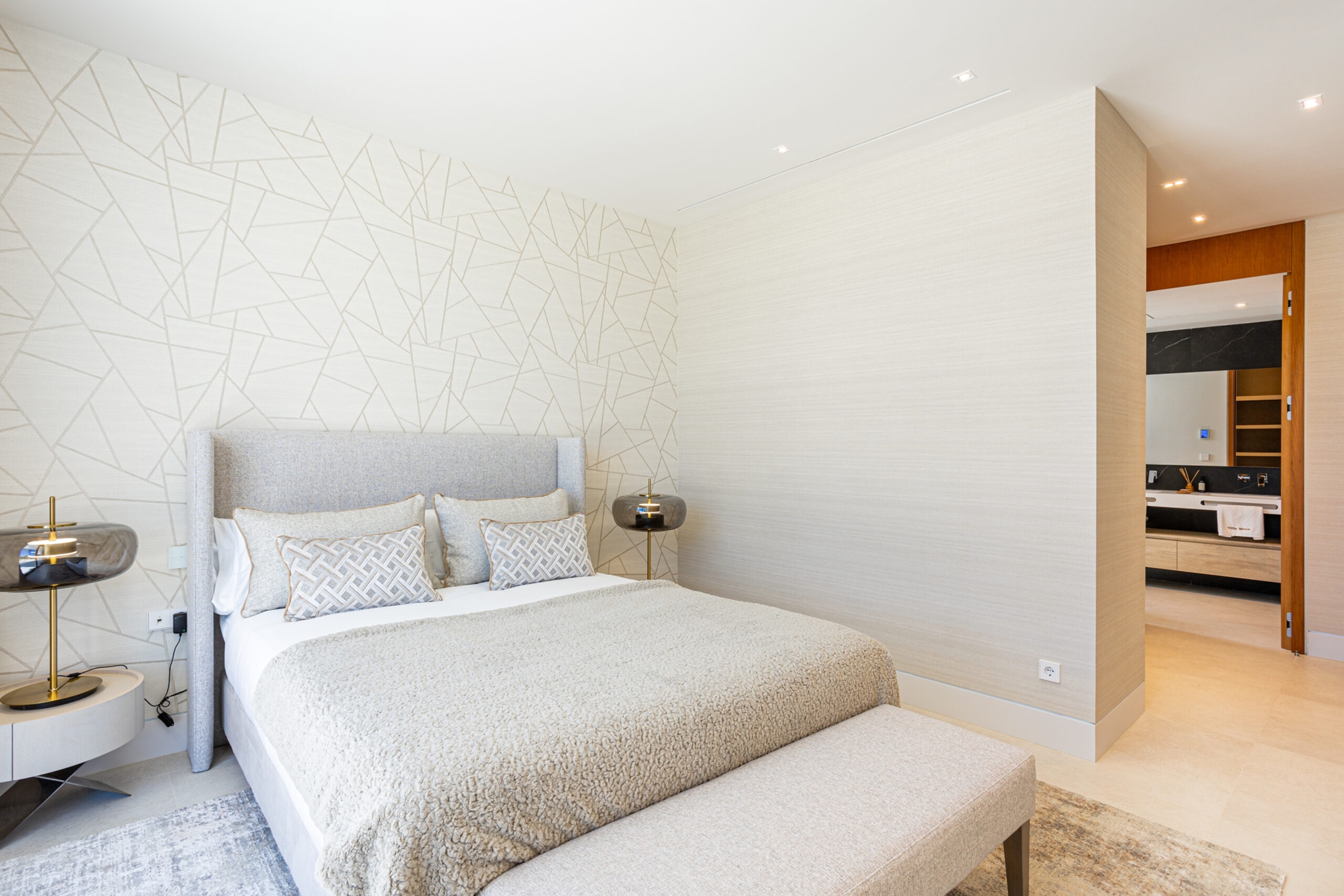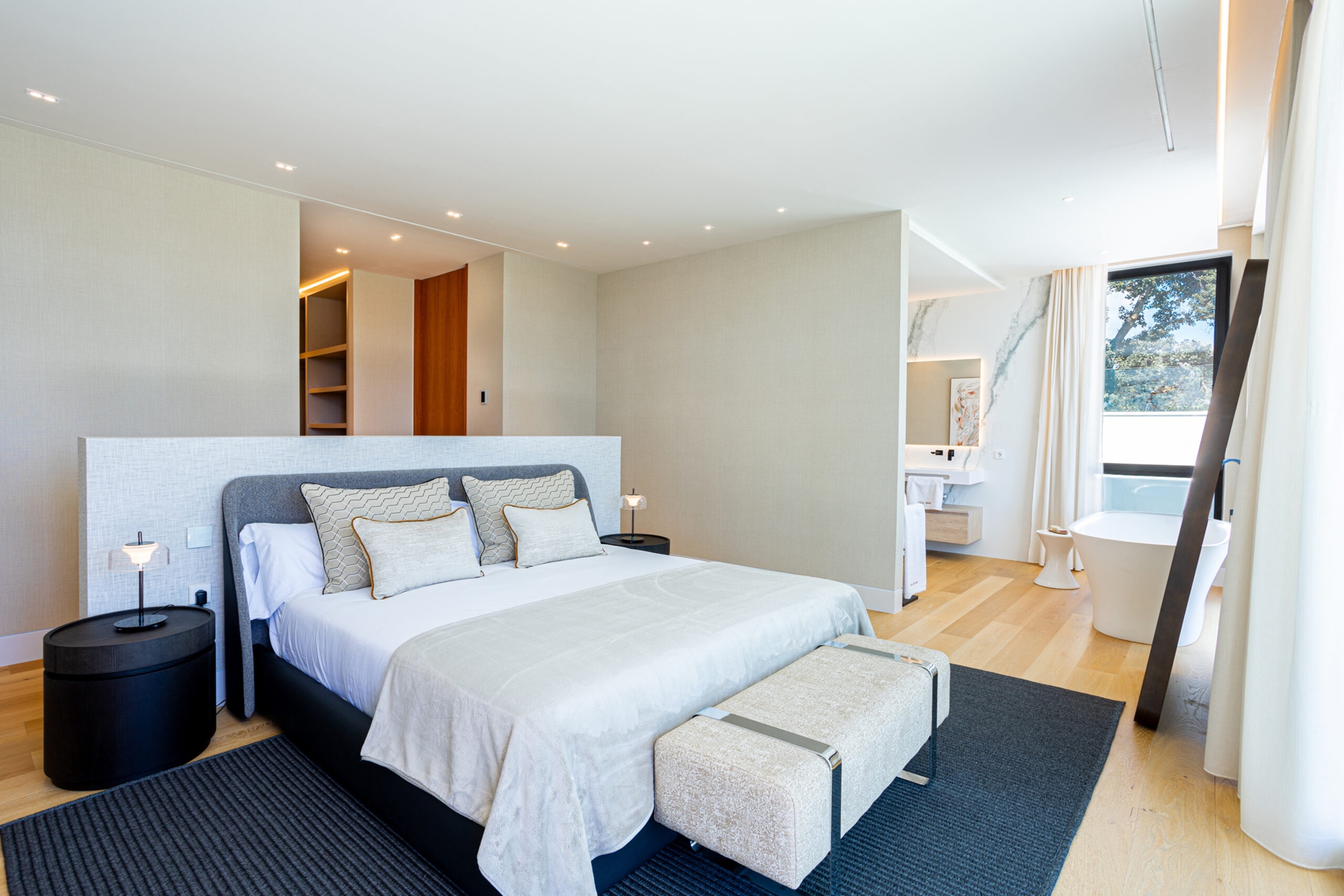 The master bedroom is an ideal private oasis, exuding comfort and style. The bedroom is connected to a private terrace that sports panoramic views of the surrounding area and Mediterranean sea.