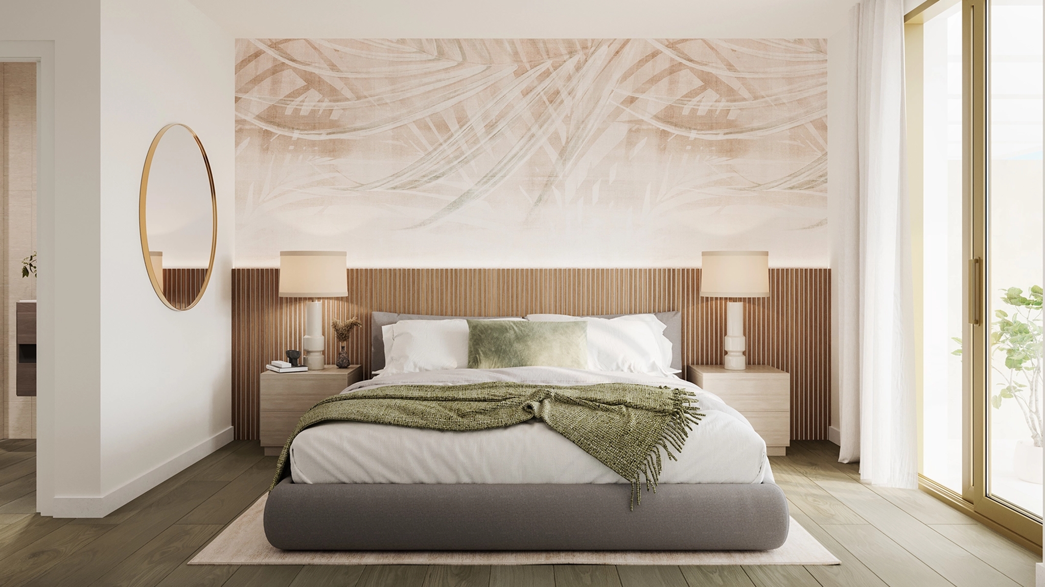 The master bedroom is an ideal private oasis, exuding comfort and style. The bedroom is connected to a private terrace that sports panoramic views of the surrounding area and Mediterranean sea.