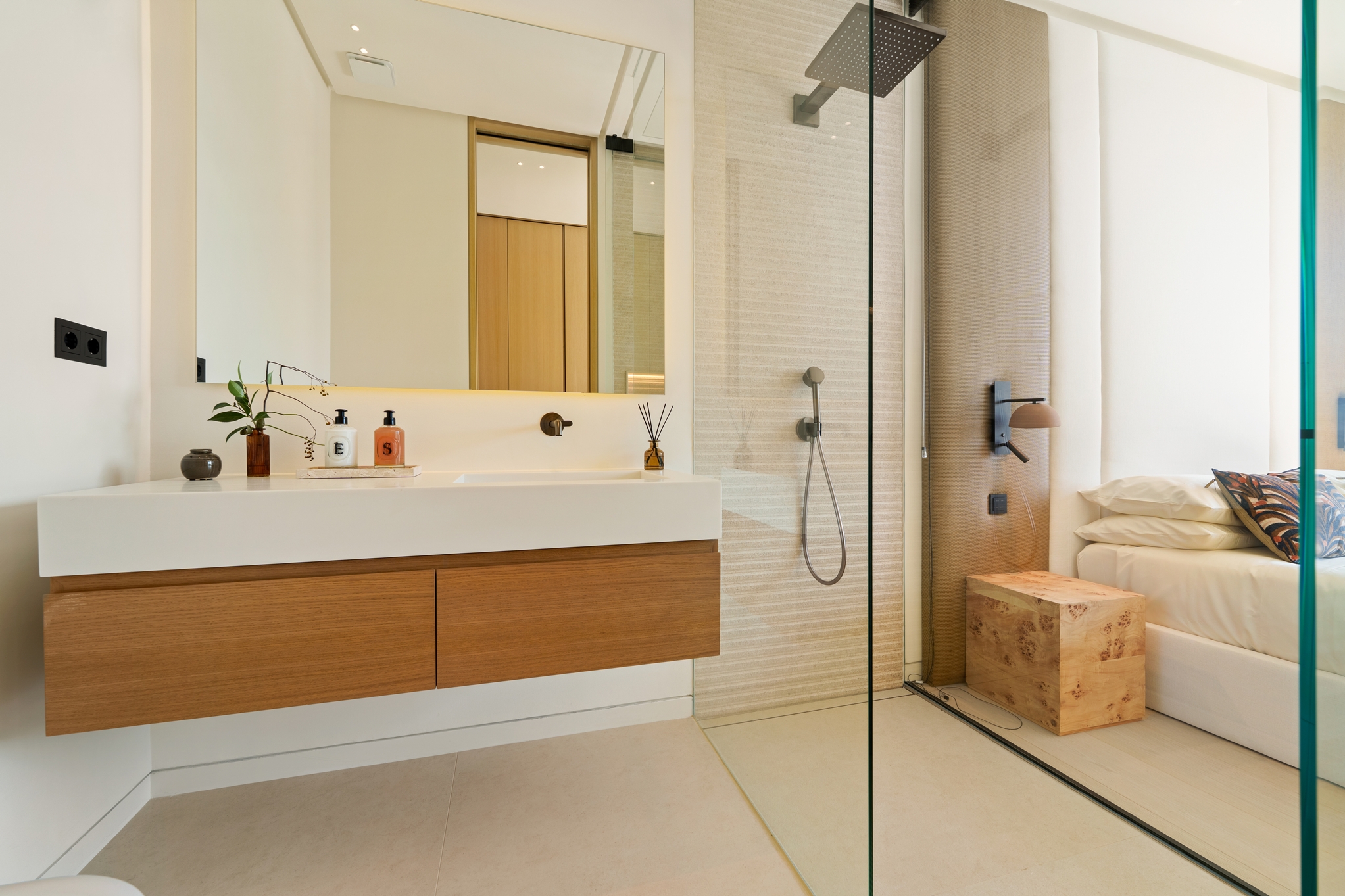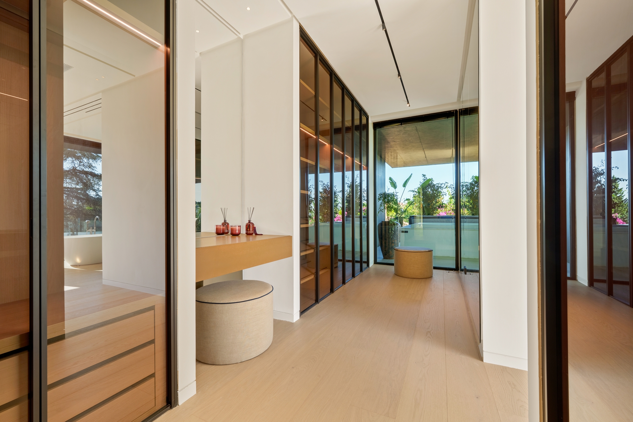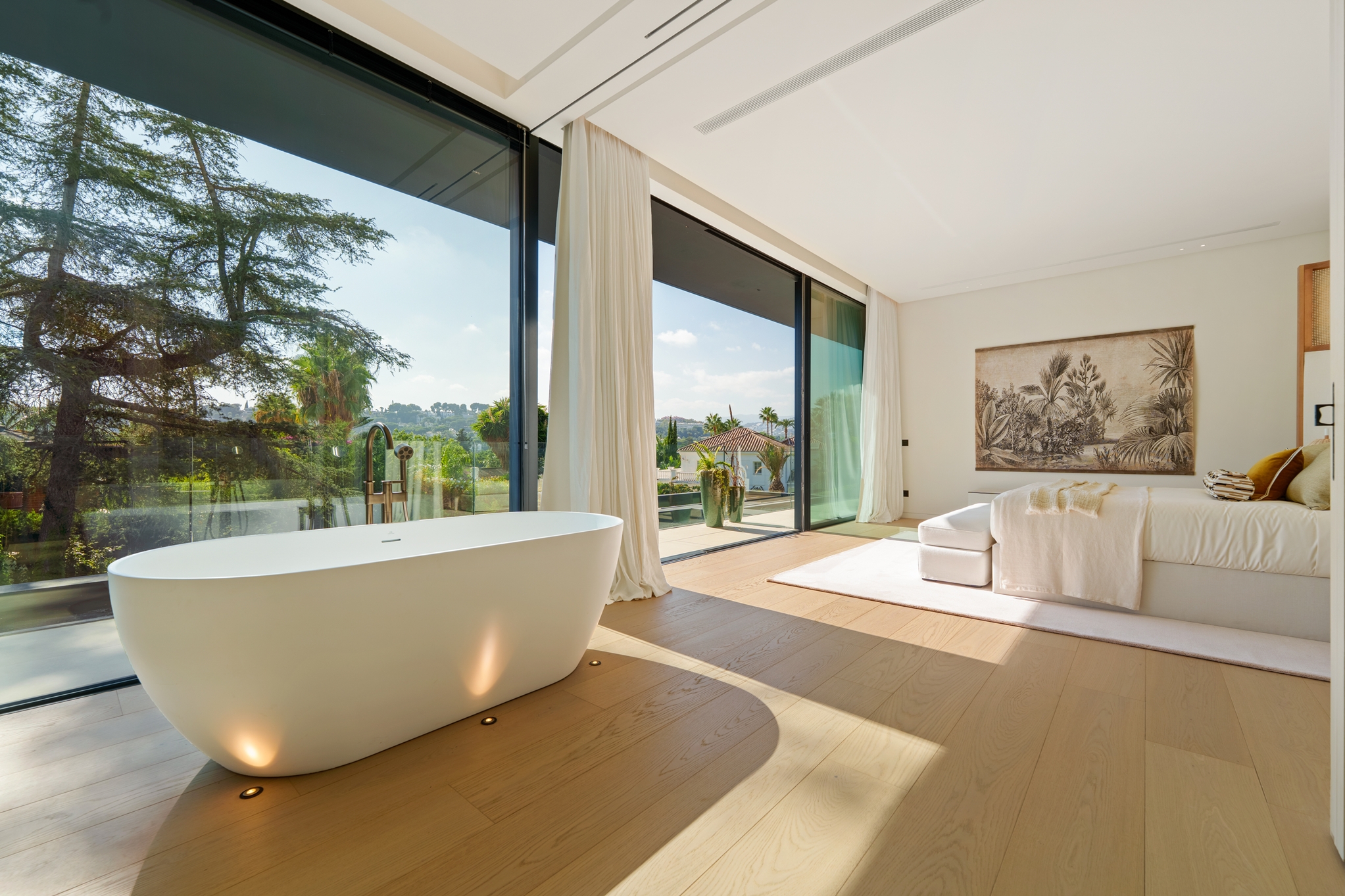 The master bedroom is an ideal private oasis, exuding comfort and style. The bedroom is connected to a private terrace that sports panoramic views of the surrounding area and Mediterranean sea.