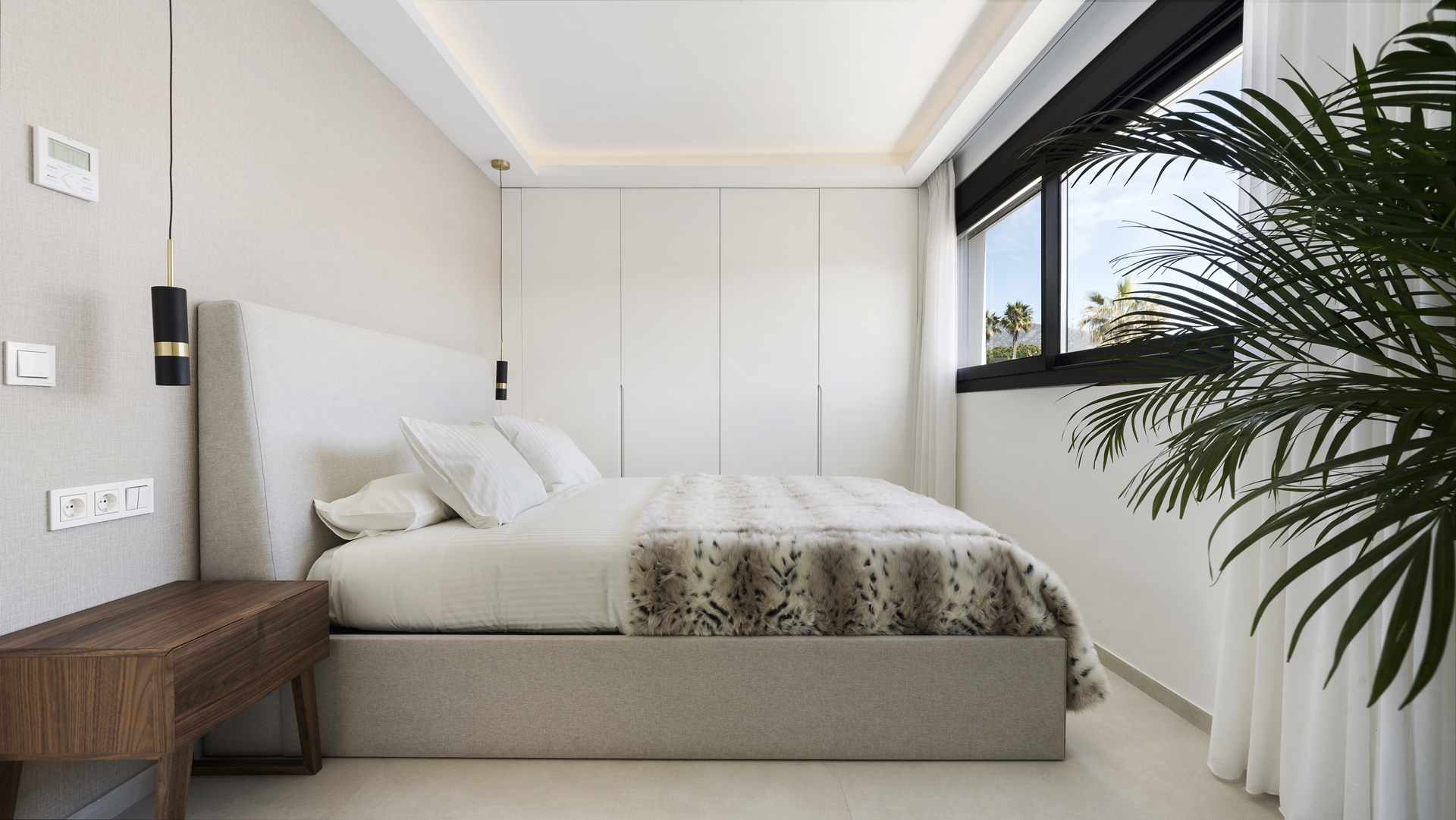 The master bedroom is an ideal private oasis, exuding comfort and style. The bedroom is connected to a private terrace that sports panoramic views of the surrounding area and Mediterranean sea.